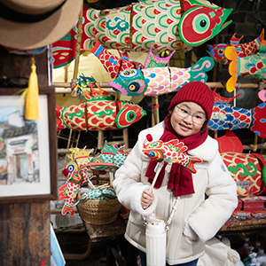 2月7日,在安徽省黄山市黟县碧山村,游客在当地民居门前手持鱼灯留影。