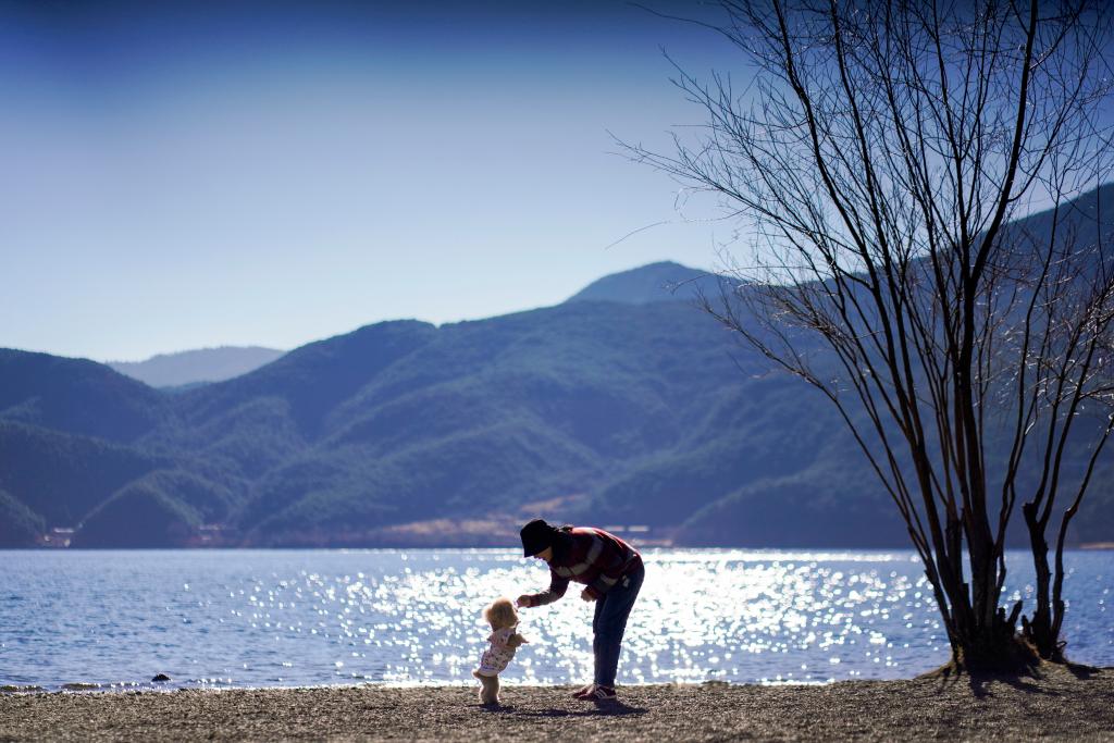2月5日,游客与爱宠在四川凉山泸沽湖景区拍照留念。