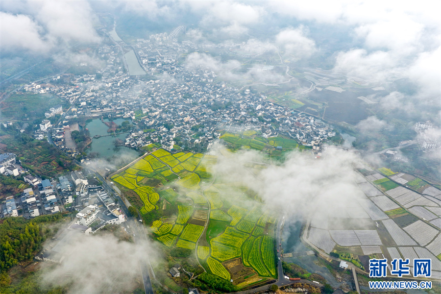 3月17日,在安徽省黄山市徽州区呈坎村拍摄的春日缤纷美景。(无人机照片)
