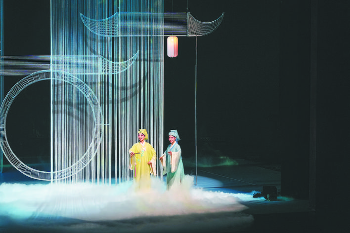 节目《十八相送》中,帘幕垂落,成为激光演绎的“大屏”。柳叶稀疏投下光影,彩蝶翩飞寓意情思,缤纷的色彩在帘幕上呈现,科技光影传递出舞台上柔情婉约的艺术氛围。