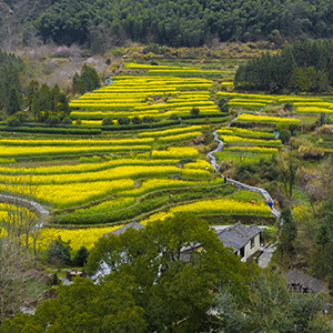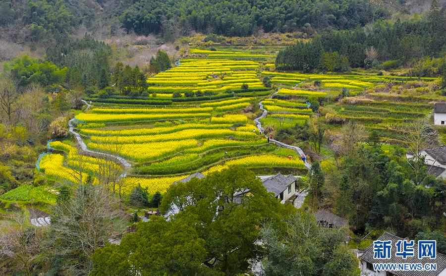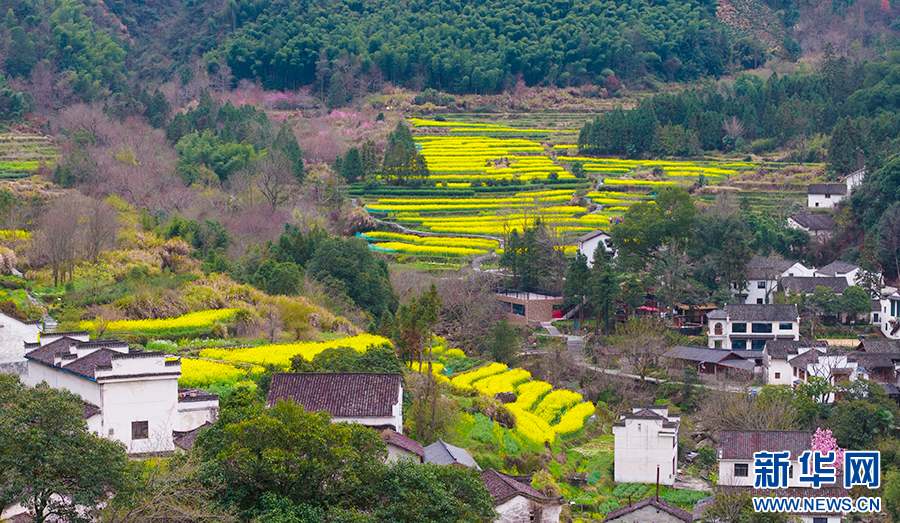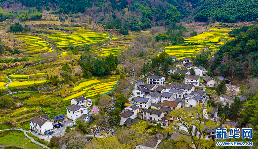 近日,安徽省池州市石台县白石岭古村落,百亩油菜花竞相绽放。金黄的花海与错落有致的民居相映成趣,吸引众多游客与摄影爱好者前来踏青赏春。(王帆 摄)