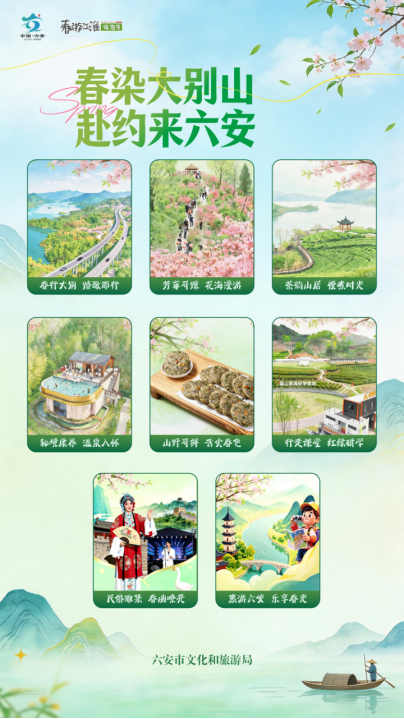 2026“春游江淮请您来”六安篇章,以“春染大别山 赴约来六安”为主题,重磅推出八大春日文旅特色系列,市县联动倾情打造800余场文旅惠民活动,将山水画卷、茶韵花香、温泉康养、红色研学、民俗潮玩、暖心福利融为一体,邀您共赴一场奔赴大别山的春日之约,沉浸式解锁六安独有的皖西春光。