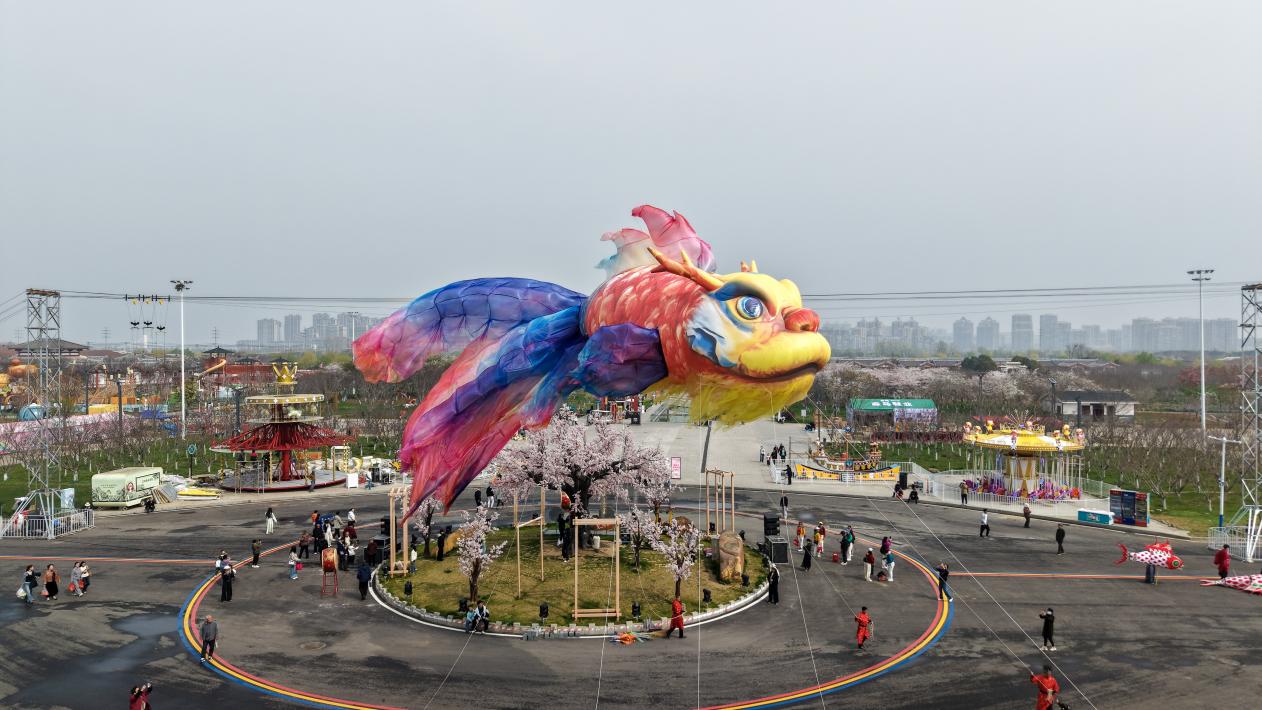 开园当日,景区内游人如织、氛围热烈。巨型鳌鱼灯巡游气势恢宏,十里红妆汉婚大典、县衙沉浸式情景演艺、凤求凰主题演艺秀轮番上演;赛博机甲天团全园巡游互动,古今碰撞、新意十足。夜幕降临,楚汉争雄非遗铁花秀、天女散樱花高空威亚秀在樱花环岛惊艳亮相,璀璨光影与漫天樱雪交相辉映,现场掌声、欢呼声不断。