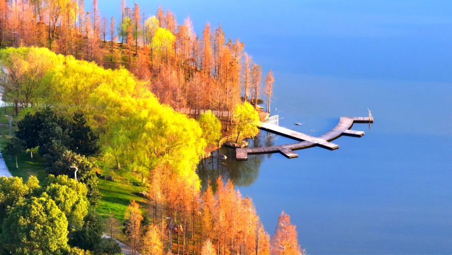 向阳草木青,明媚春光暖。春分之后的安徽省颍上县五里湖湿地公园,湖面碧波潋滟,岸边垂柳依依,花儿竞相绽放,构成一幅令人赏心悦目的春日画卷。(徐红梅)