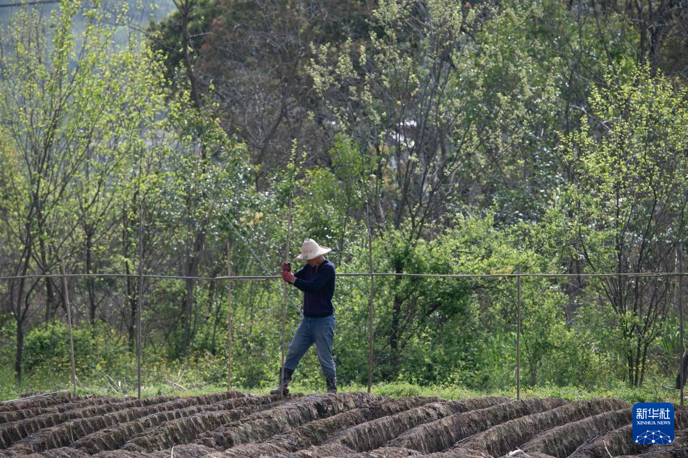 4月5日,在安徽省铜陵市郊区大通镇大院村,农民给种下的铜陵白姜搭建姜棚。新华社记者 张端 摄