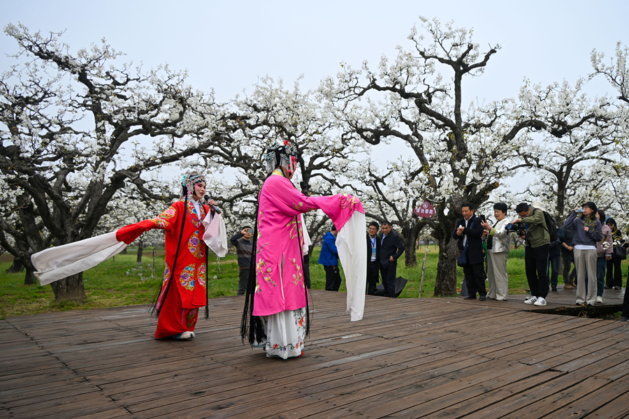 3月30日,游客在砀山县梨树王风景区观赏表演。新华社发(崔猛 摄)