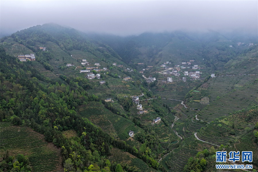 4月14日,航拍的安徽省黄山市歙县璜田乡蜈蚣岭村梯田茶园(无人机照片)。