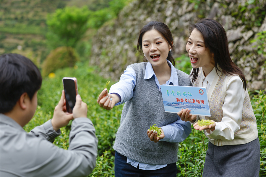 4月14日,安徽省黄山市歙县璜田乡蜈蚣岭村,主播在茶园里通过“和美乡村直播间”推介高山茶叶。