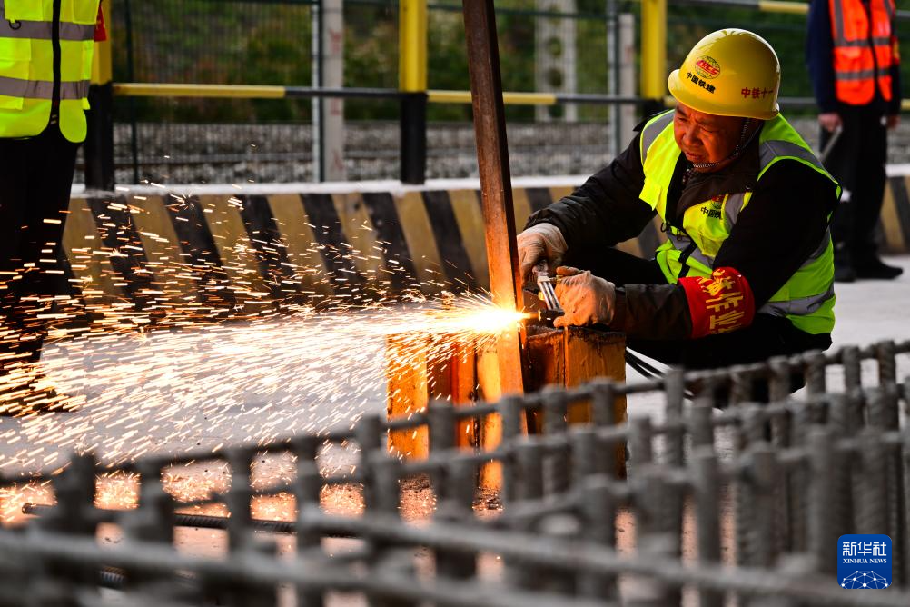 4月21日,中铁十一局工人在合武高铁跨宁西铁路万吨连续梁转体施工现场忙碌。新华社记者 刘军喜 摄