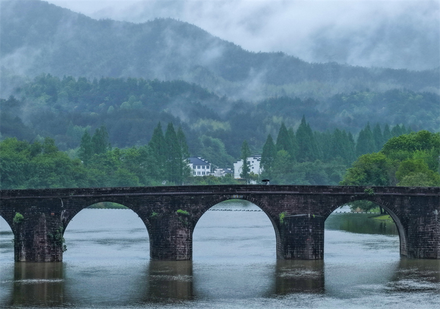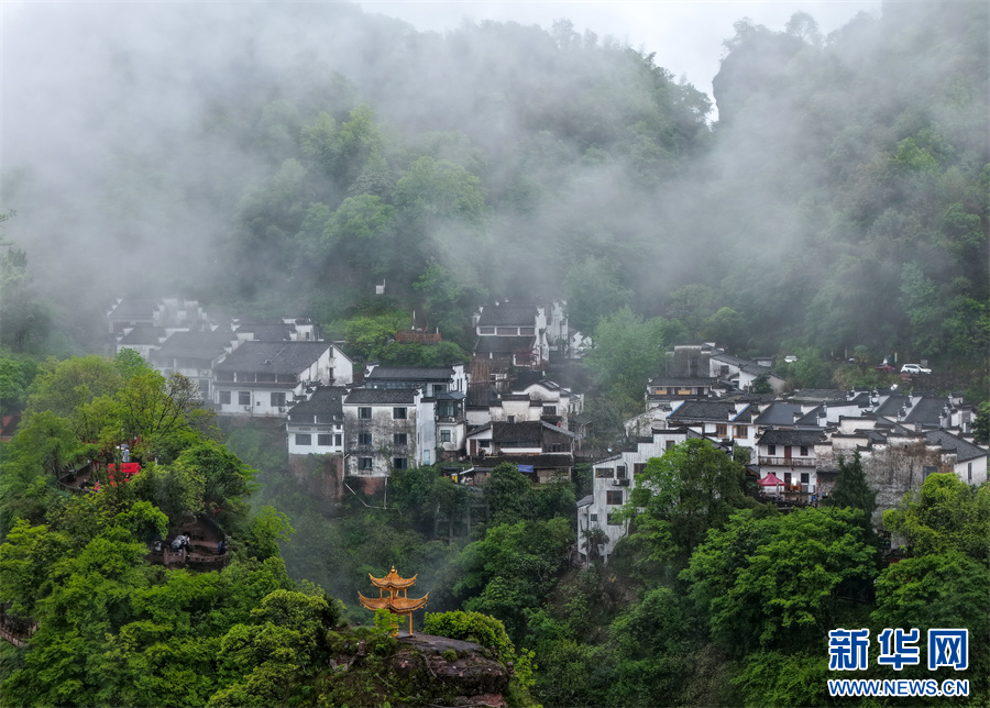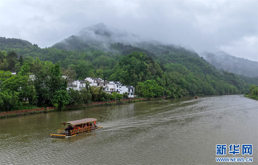 当日,春雨绵绵的安徽省黄山市休宁县齐云山景区风光旖旎,青山如黛,烟云缥缈,徽派民居若隐若现。游客泛舟横江,宛若穿行在水墨画卷中,令人心旷神怡。新华网发(施亚磊 摄)