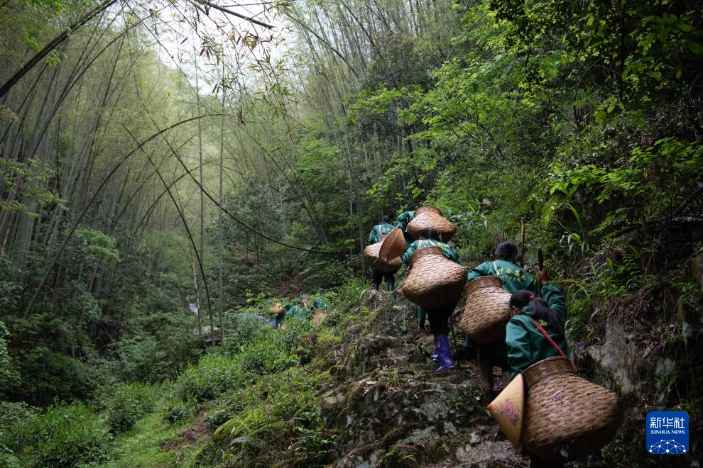 4月24日,在黄山市黄山区新明乡猴坑村,采茶工结束采摘后离开高山茶园。
